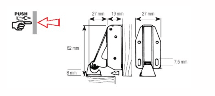 Druksluiting, openen door te drukken op de deur, de deur komt hierbij ca. 20